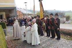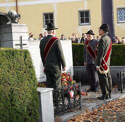 Am Nachmittag des Allerheiligentages rückte der Kameradschaftsbund zur Andacht und Friedhofsfeier aus. Am Kriegerdenkmal war die Trauerfahne gehisst und ein Kranz niedergelegt. Nach der Andacht in der Kirche nahm der Kameradschaftsbund vor dem Kriegerdenkmal Aufstellung. Altpfarrer P. Paulus Nimmervoll gedachte nicht nur der Gefallenen und Vermissten der Weltkriege, sondern auch all derjeniger, die im Einsatz für die Allgemeinheit, durch Terrorimus oder im Straßenverkehr ihr Leben gelassen haben. Die Musikapelle spielete zur Ehrung den "Guten Kameraden". Danach setze sich der Zug der Pfarrgemeinde, angeführt von Musikkapelle und Kameradschaftsbund in Bewegung zum Friedhof, wo P. Paulus die Gräber segnete.