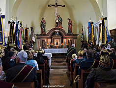 Der Gottesdienst fand diesmal wegen des Wetters in der Bergkirche statt. Die Fahnenträger nahmen mit den Fahnen zu beiden Seiten des Altares Aufstellung. Die bis auf den letzten Platz gefüllte Bergkirche bot ein buntes Bild und war durch das Kerzenlicht in eine feierliche Stimmung getaucht. Der aus Gramastetten gebürtige Redemptoristenbruder Diakon Josef Doppler segnete zunächst die vor der Kirche aufgestellten Pferde und hielt dann den Wortgottesdienst. Die Musikapelle Gramastetten spielte die Schubertmesse. Zum Abschluss sangen die Teilnehmer unter den vollen Klängen der Bläser die Landeshymne.